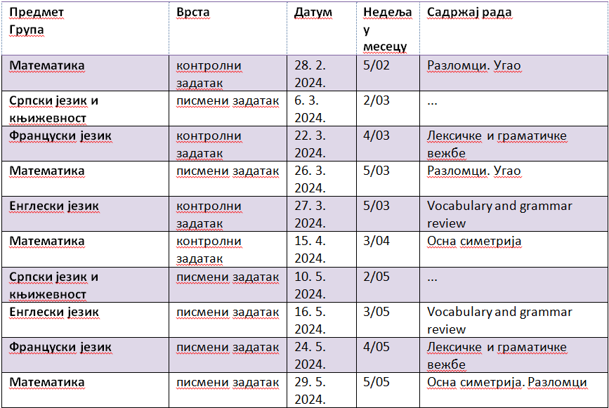 Распоред писмених и контролних вежби и тестова