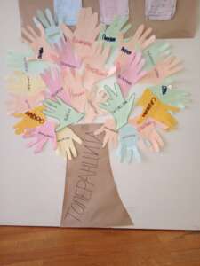 Учитељица Дина Маслић Радојичић је у боравку са ученицима 1. и 2. разреда одржала радионицу Толеранција. Ученици су на папирима у боји исцртали своје шаке, исекли их а затим на њима писали речи које асоцирају на толеранцију. Затим је од тих шака направљена крошња на дрвету толеранције. Кроз ове активности деци помажемо да развију важне социјалне вештине и да постану свеснији и осетљивији на потребе других.