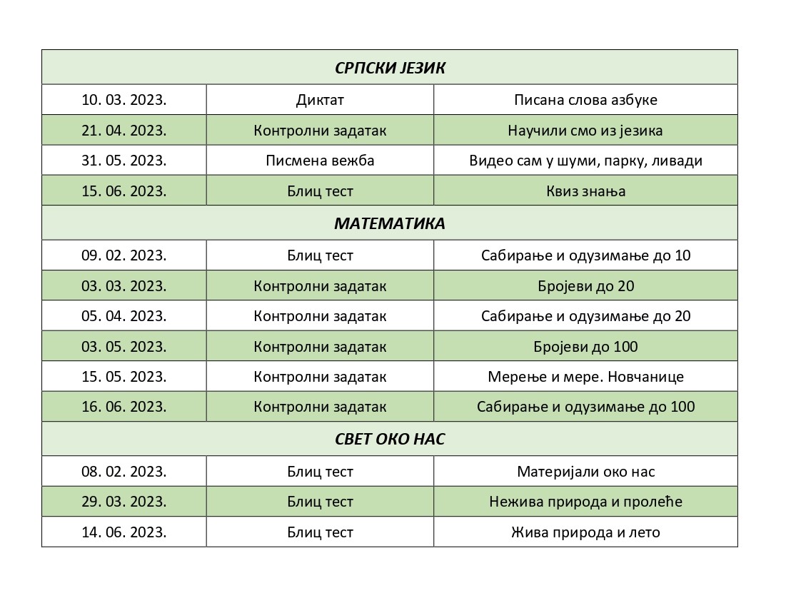 Распоред писмених и контролних вежби и тестова